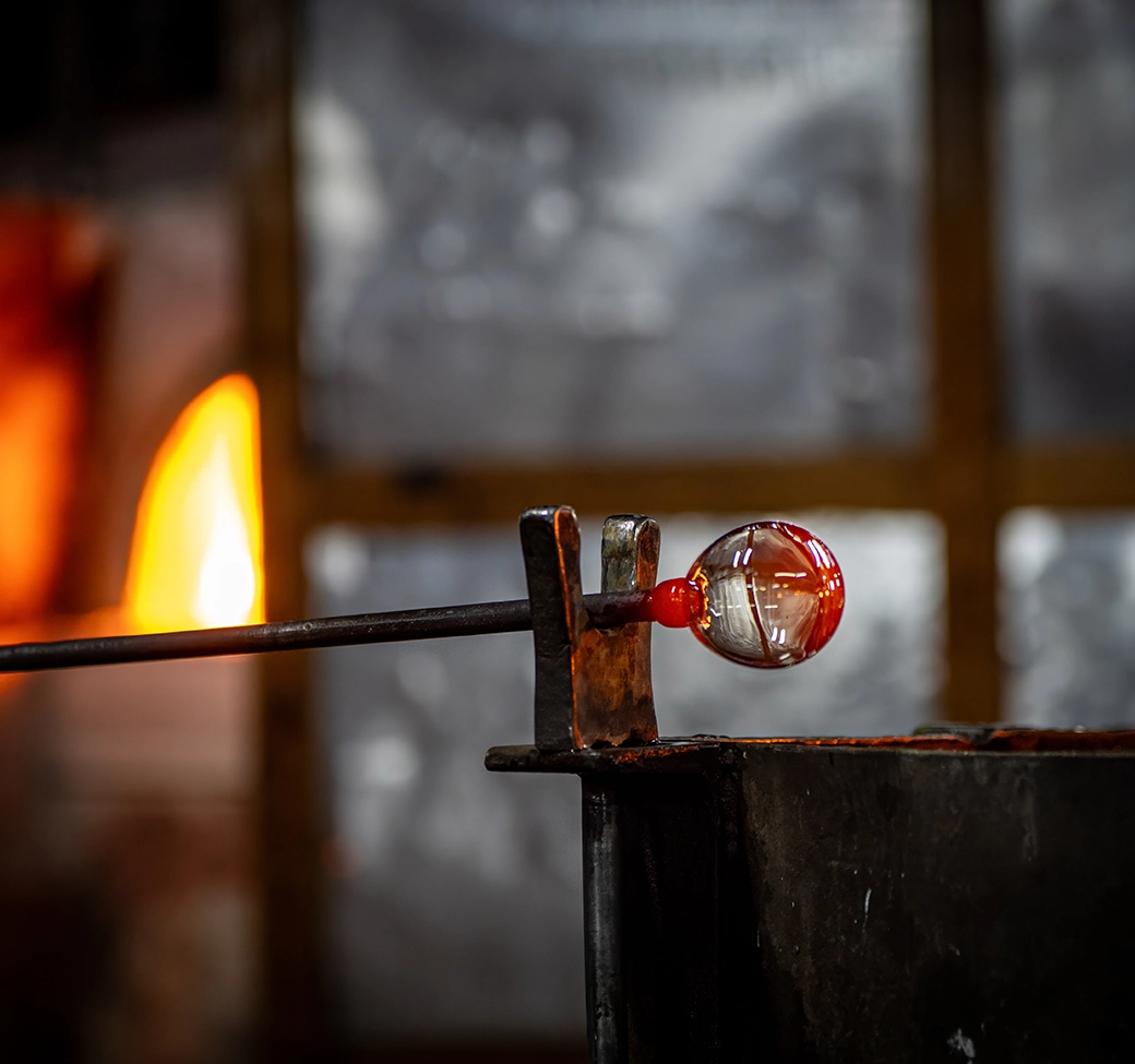Flüssige Glasmasse wird mit der Butzenpfeife aus dem Ofen entnommen. Die Glasmenge ist dabei maßgebend für die spätere Größe der Butze. Danach wird das Glas zu einer kleinen Kugel aufgeblasen. Deren Umfang ist das zweite wichtige Kriterium für die Größe. Es unterliegt dem Können und der Erfahrung des Meisters, eine gleichmäßige und hochwertige Butze zu schaffen. Die kleine, noch heiße Kugel wird jetzt an ein Hefteisen geklebt und von der Glasmacherpfeife abgeschlagen.