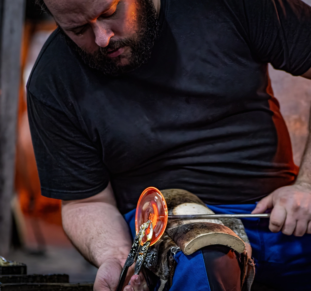 Nach erneutem Einwärmen wird diese mit der Auftreibschere geöffnet. Durch eine spezielle Technik schlägt der Butzenmacher den Rand um, so wird eine bessere Stabilität und Verarbeitbarkeit erreicht. In einer rotierenden Drehbewegung wird dann eine kleine, runde Butzenscheibe geformt. Nach Erreichen der endgültigen Größe wird sie abgeschlagen und im Kühlofen langsam abgekühlt.