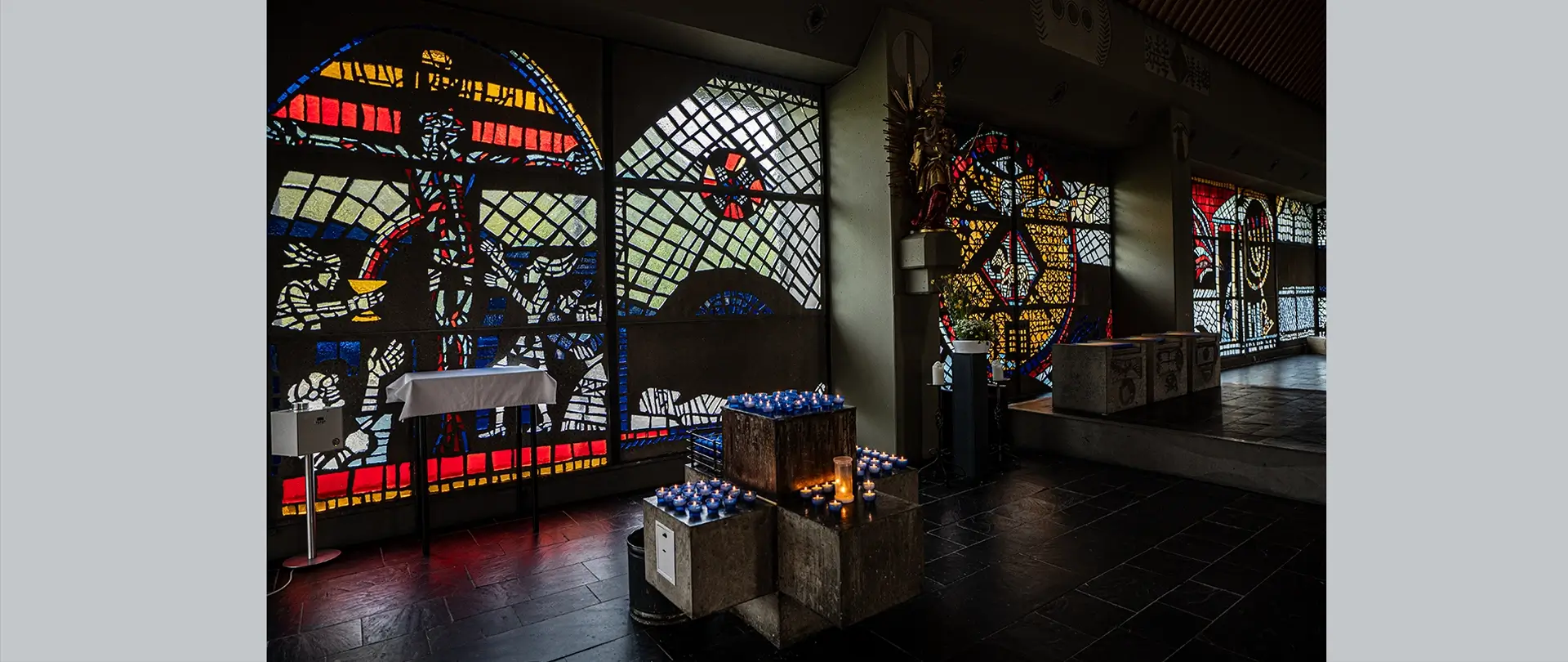 Diese Teile werden auf einem Tisch zu einer Gestaltung arrangiert. Die Zwischenräume werden zur mechanischen Stabilisierung mit speziellem Mörtel ausgegossen. Nach Aushärten des Mörtels werden die entstandenen Elemente in die Fensteröffnungen eingesetzt.